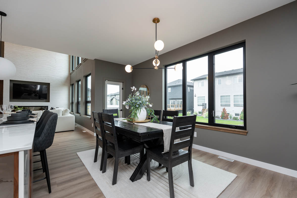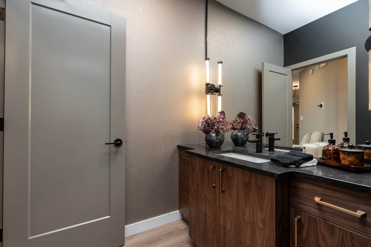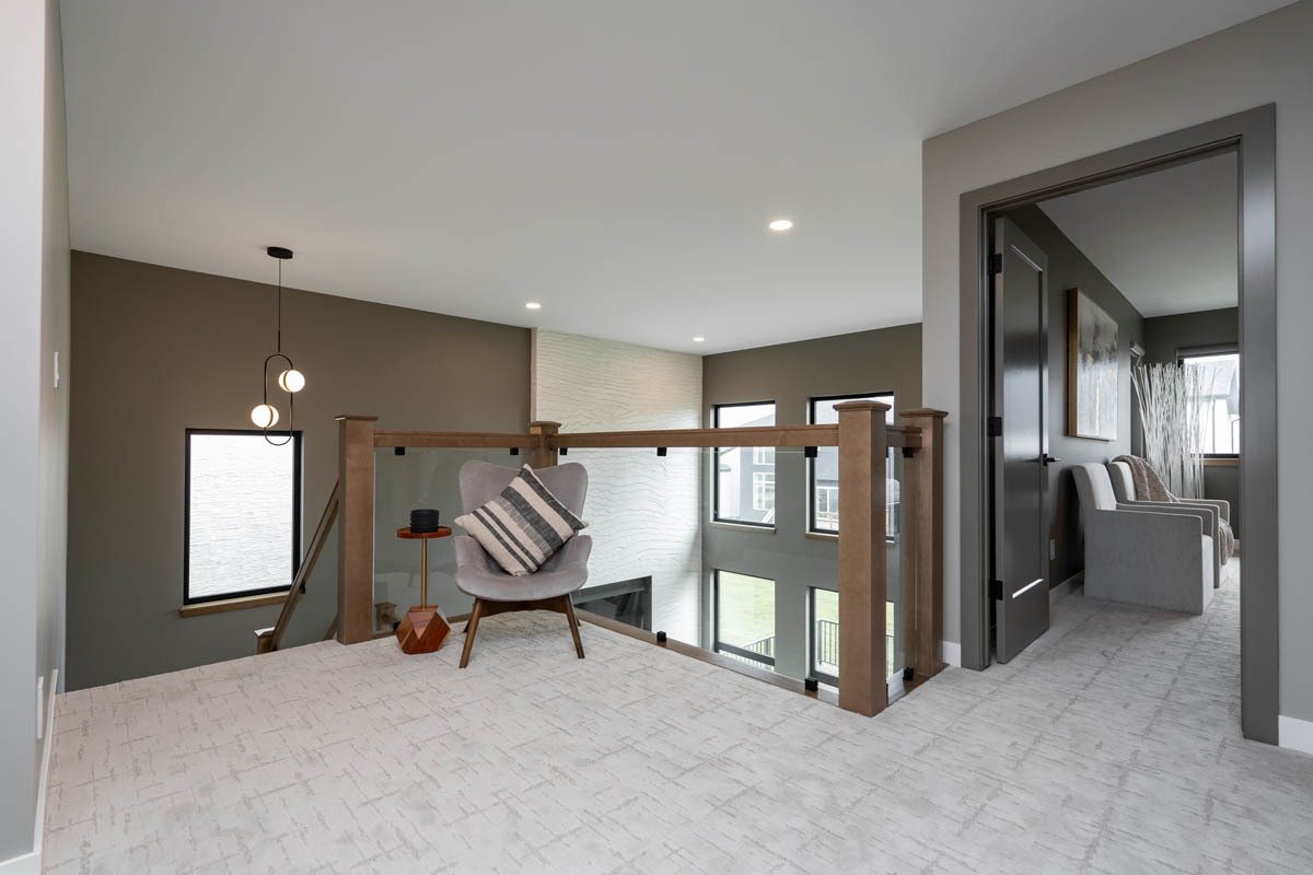- Open-to-above great room with entertainment unit including electric fireplace, walnut stained art nook, and floor to ceiling textured panels