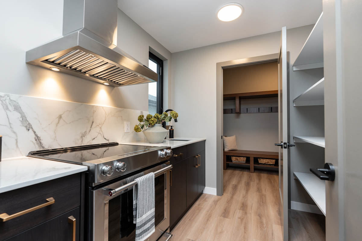 - Walk-thru spice kitchen with matching finishes and additional storage space