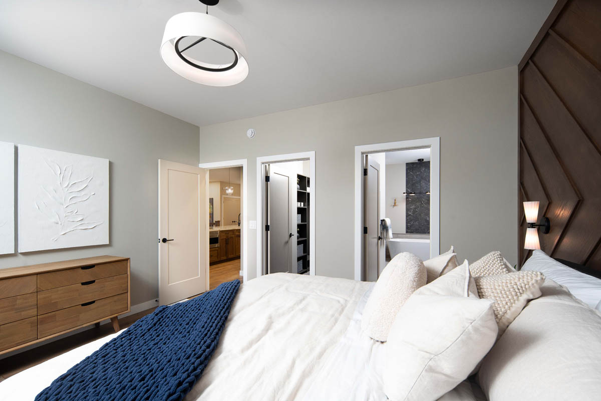 - Feature wall in primary bedroom includes wood panels in a chevron pattern with wall sconces