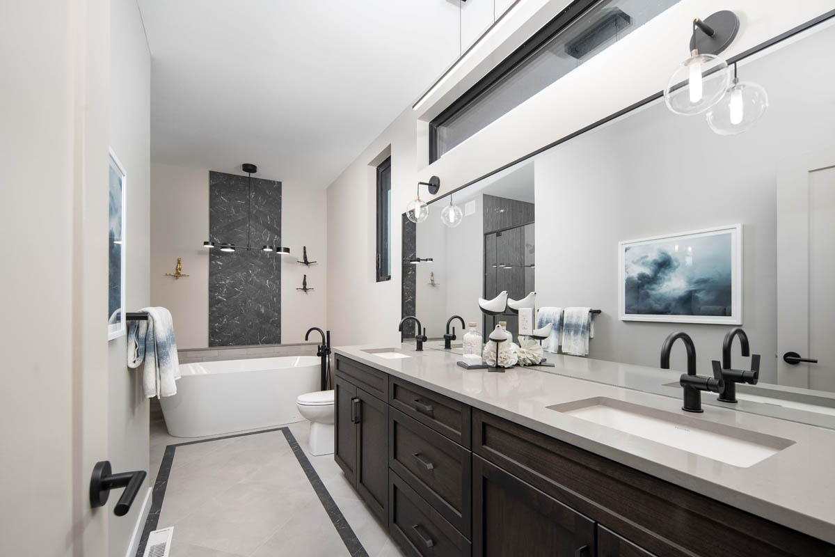 - Luxe ensuite complete with tile flooring, tile shower, and soaker tub with tile feature wall
